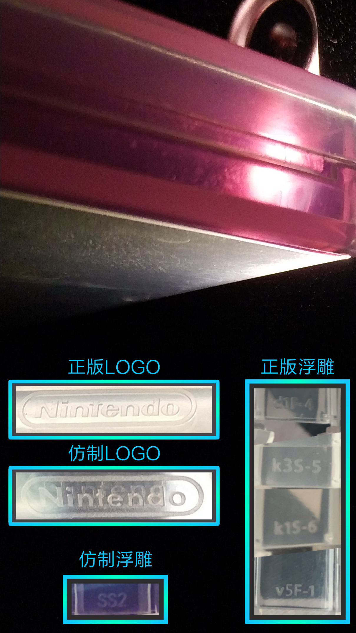 由于仿制卡盒与官方卡盒所用材料不同,紫外线照射(如淘宝爆款非常便宜的验钞灯)可以让仿制品在黑暗环境下发出明显的绿色荧光,而亚标正品则不会。