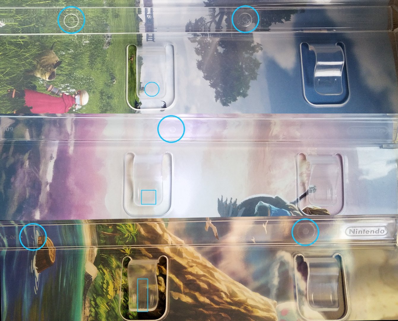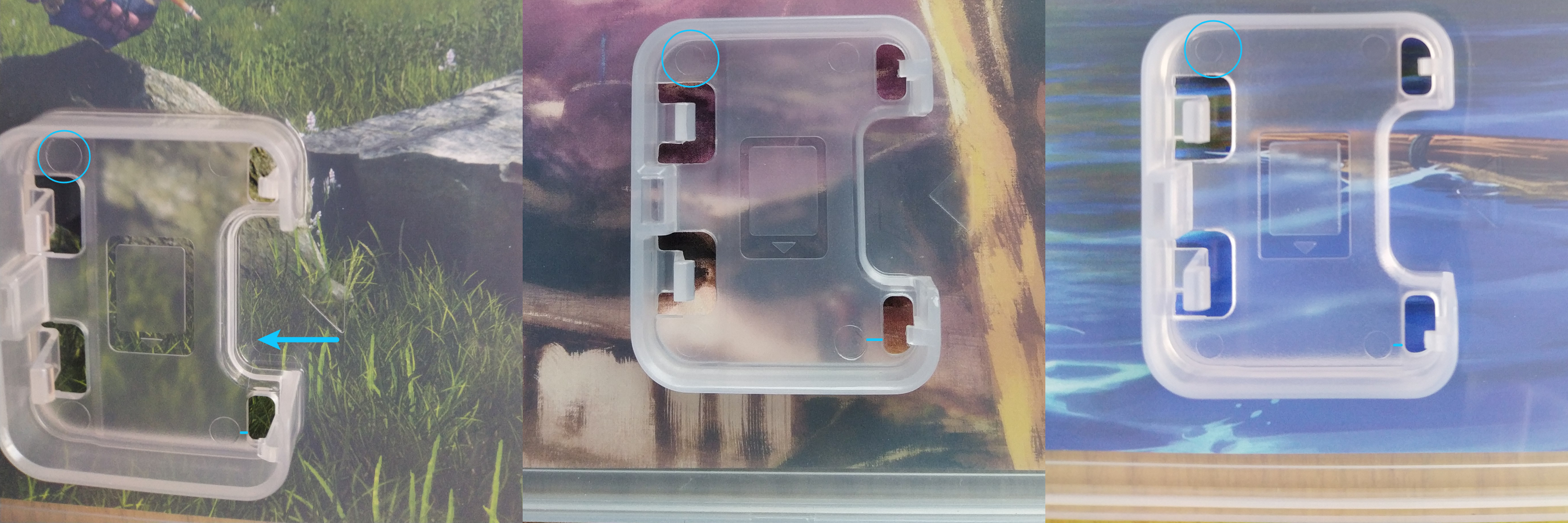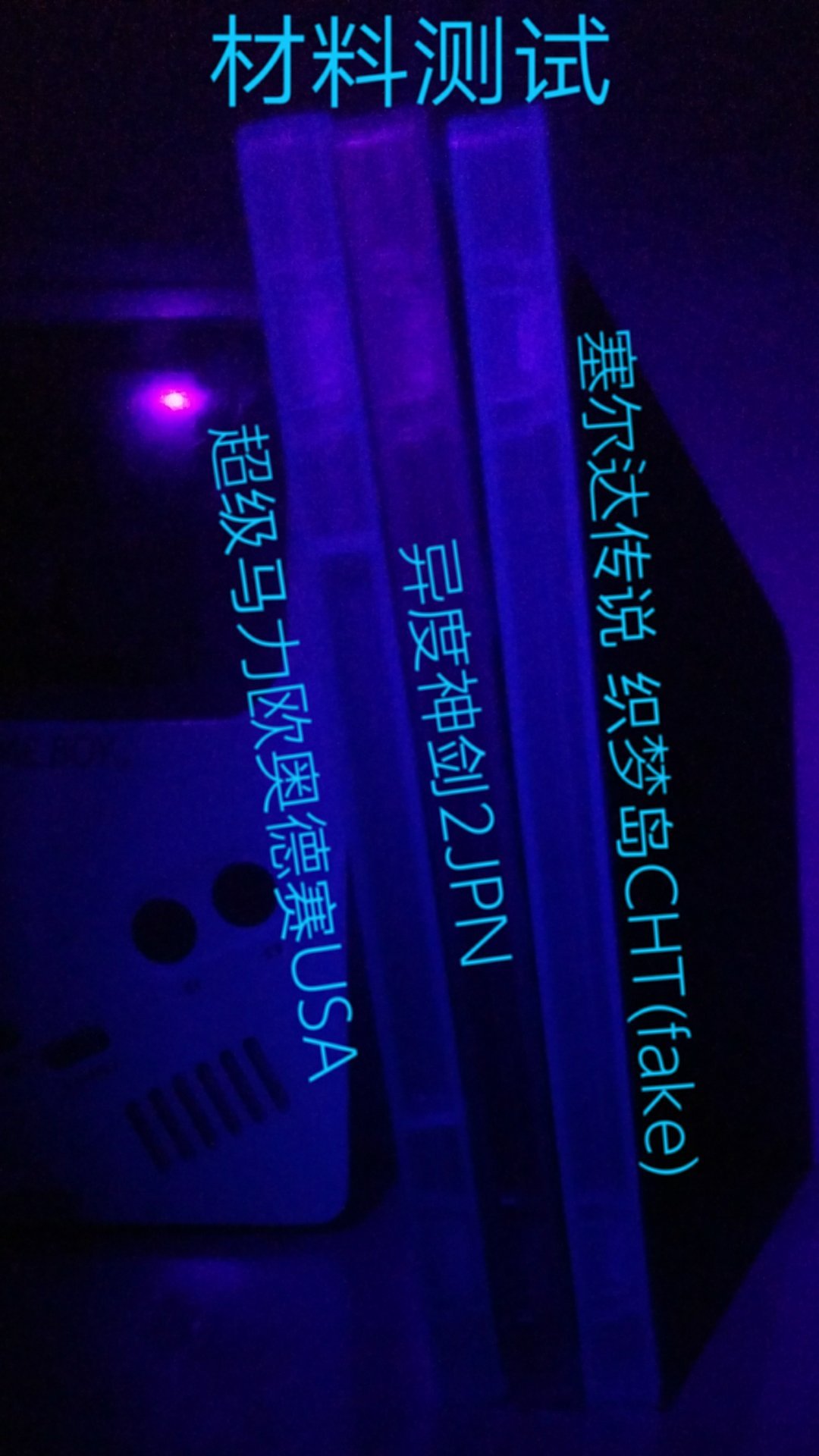 由于仿制卡盒与官方卡盒所用材料不同,紫外线照射(如淘宝爆款非常便宜的验钞灯)可以让仿制品在黑暗环境下发出明显的绿色荧光,而亚标正品则不会。