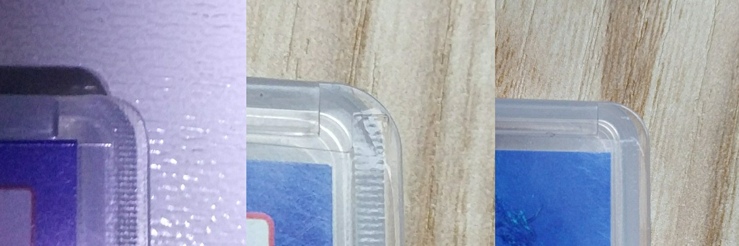 如图,正品卡盒的封面保护膜接缝边缘清晰;仿制品的边缘是“渐变式”,延伸到了圆弧上。且两者的纹理也有明显区别。这个方法适用于不拆塑封验货。