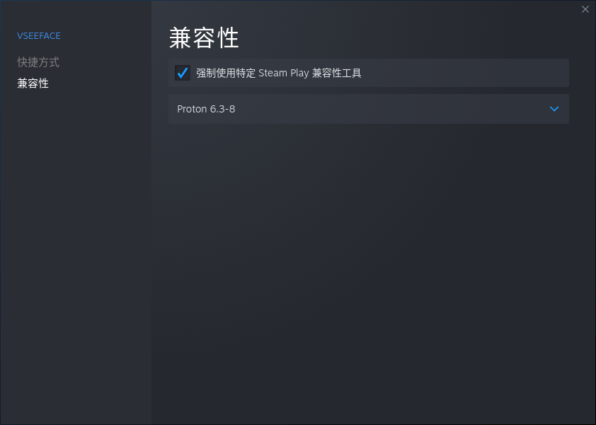在Steam游戏列表里找到VSeeFase.exe,右键”属性”,勾选”强制使用特定Steam Play兼容性工具”。 我这里选择的是Proton 6.3-8,理论上越新越好。