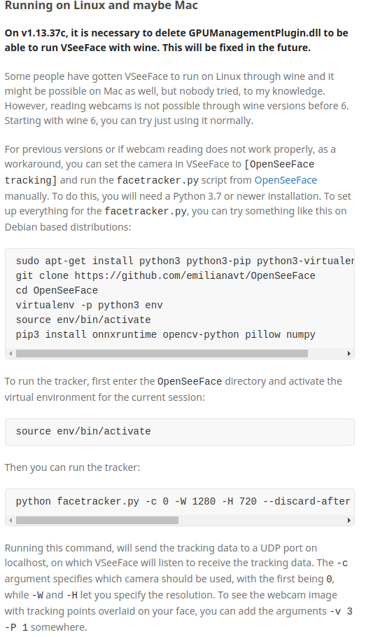 简而言之就是:直接运行其开源的Python3面捕后端OpenSeeFace,然后用Wine兼容运行闭源的渲染前端VSeeFace,接收后端发送到UDP端口上的面捕数据。